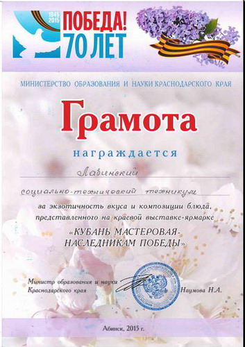 ГБПОУ КК «Лабинский социально-технический техникум» награждено грамотой Министерства образования и науки Краснодарского края, за экзотичность вкуса и композиции блюда, представленного на краевой выставке-ярмарке «Кубань мастеровая – наследникам Победы».